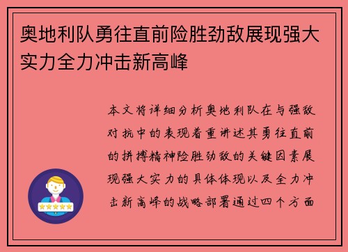 本文将详细分析奥地利队在与强敌对抗中的表现,着重讲述其勇往直前的拼搏精神、险胜劲敌的关键因素、展现强大实力的具体体现以及全力冲击新高峰的战略部署。通过四个方面的深入探讨,展现奥地利队在竞技体育领域中的...