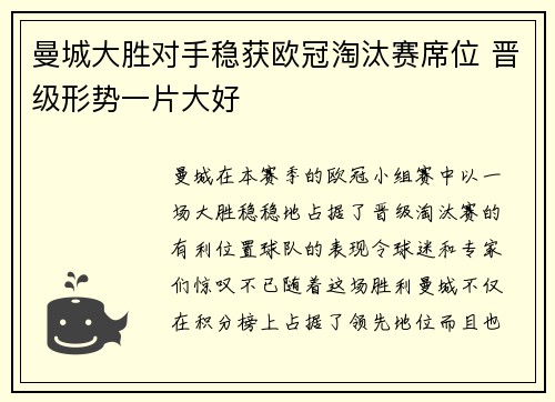 曼城在本赛季的欧冠小组赛中,以一场大胜稳稳地占据了晋级淘汰赛的有利位置,球队的表现令球迷和专家们惊叹不已。随着这场胜利,曼城不仅在积分榜上占据了领先地位,而且也为自己的晋级之路铺平了道路。球队的出色表...