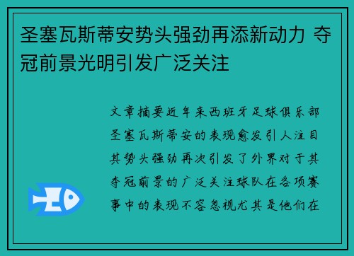 圣塞瓦斯蒂安势头强劲再添新动力 夺冠前景光明引发广泛关注