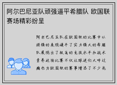 阿尔巴尼亚队在欧国联的比赛中,以顽强的表现逼平了实力强大的希腊队,展现出了极高的竞技水平和战术素养。这场比赛不仅让球迷们大呼过瘾,也为欧国联的赛事增添了不少亮点。从比赛的精彩过程到两队球员的出色表现,再到战术上的较量,每一个细节都让这场对决...