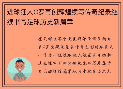 进球狂人C罗再创辉煌续写传奇纪录继续书写足球历史新篇章