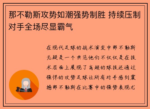 那不勒斯攻势如潮强势制胜 持续压制对手全场尽显霸气
