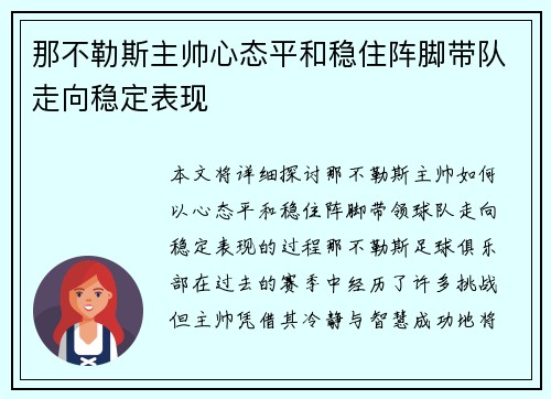 本文将详细探讨那不勒斯主帅如何以心态平和、稳住阵脚,带领球队走向稳定表现的过程。那不勒斯足球俱乐部在过去的赛季中经历了许多挑战,但主帅凭借其冷静与智慧成功地将球队从低谷带到了新的高度。本文将从四个方面分析这位主帅如何通过平和心态稳住阵脚,包...