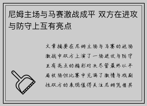 尼姆主场与马赛激战成平 双方在进攻与防守上互有亮点