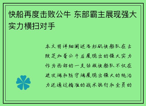 快船再度击败公牛 东部霸主展现强大实力横扫对手