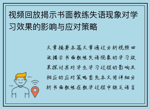 文章摘要:本篇文章通过分析视频回放揭示书面教练失语现象的学习效果,探讨其对学生学习过程的影响及相应的应对策略。首先,本文将详细分析书面教练在教学过程中缺乏语言交流时对学习效果的负面影响,尤其是如何导致学习者理解障碍和思维局限。接着,文章会阐...