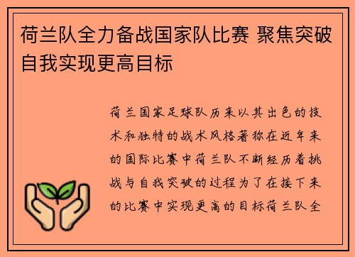 荷兰队全力备战国家队比赛 聚焦突破自我实现更高目标
