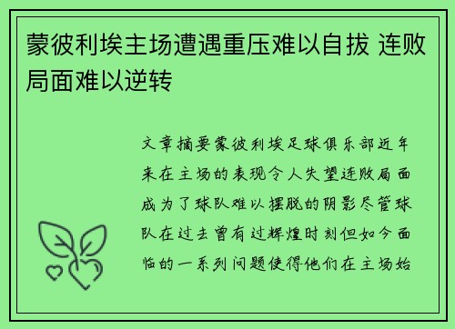 文章摘要:蒙彼利埃足球俱乐部近年来在主场的表现令人失望,连败局面成为了球队难以摆脱的阴影。尽管球队在过去曾有过辉煌时刻,但如今面临的一系列问题使得他们在主场始终无法发挥出应有的水平。本篇文章将从多个角度对蒙彼利埃主场遭遇重压的现状进行剖析,...