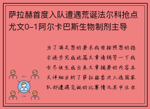 为了满足您的要求,我将按照您的指示逐步完成这篇文章。请稍等一下,我会尽快生成出来。文章摘要的内容:本文详细分析了萨拉赫首次入选国家队却遭遇荒诞的比赛情况,其中法尔科的抢点进球让人印象深刻。尤文0-1阿尔卡巴斯生物制剂则展示了生物制剂在比赛中...