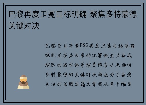 巴黎圣日耳曼(PSG)再度卫冕目标明确,球队正在为未来的比赛做全力备战。球队的战术体系、球员阵容以及面对多特蒙德的关键对决,都成为了备受关注的话题。本篇文章将从多个维度进行详细分析,重点聚焦巴黎再度卫冕的目标及其在欧冠中的关键对决。首先,文...