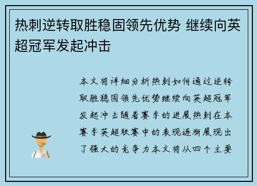 本文将详细分析热刺如何通过逆转取胜稳固领先优势,继续向英超冠军发起冲击。随着赛季的进展,热刺在本赛季英超联赛中的表现逐渐展现出了强大的竞争力。本文将从四个主要方面阐述热刺的优势,包括:球队的战术调整与阵容深度,关键球员的出色表现,教练安东尼...