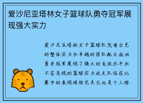 爱沙尼亚塔林女子篮球队勇夺冠军展现强大实力