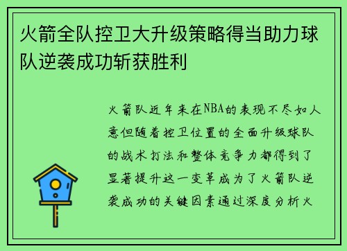 火箭全队控卫大升级策略得当助力球队逆袭成功斩获胜利