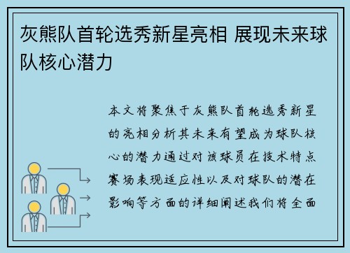 本文将聚焦于灰熊队首轮选秀新星的亮相,分析其未来有望成为球队核心的潜力。通过对该球员在技术特点、赛场表现、适应性以及对球队的潜在影响等方面的详细阐述,我们将全面探讨这位新星如何在不久的将来成为灰熊队的核心力量。文章将从四个方面进行深入分析,...