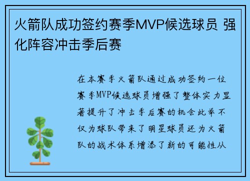 火箭队成功签约赛季MVP候选球员 强化阵容冲击季后赛