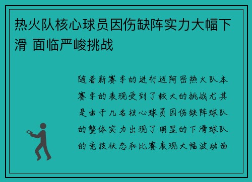 热火队核心球员因伤缺阵实力大幅下滑 面临严峻挑战