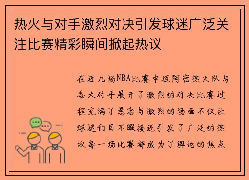 热火与对手激烈对决引发球迷广泛关注比赛精彩瞬间掀起热议