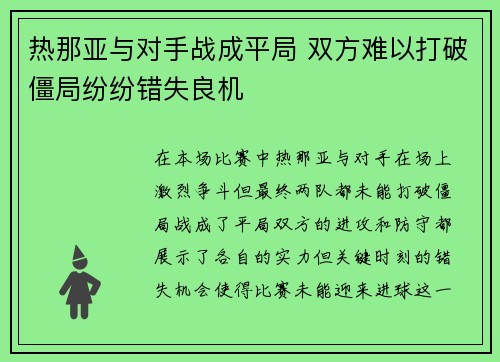在本场比赛中,热那亚与对手在场上激烈争斗,但最终两队都未能打破僵局,战成了平局。双方的进攻和防守都展示了各自的实力,但关键时刻的错失机会使得比赛未能迎来进球。这一局面反映了现代足球中的一些普遍问题,如攻防转换的效率、球员个人状态的起伏以及比...