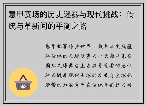 意甲赛场的历史迷雾与现代挑战:传统与革新间的平衡之路