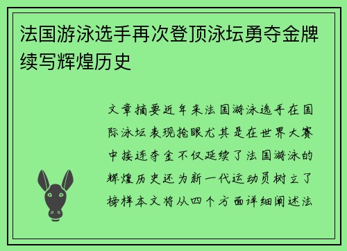 法国游泳选手再次登顶泳坛勇夺金牌续写辉煌历史