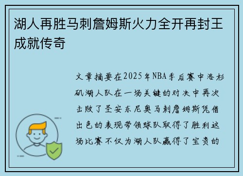 文章摘要:在2025年NBA季后赛中,洛杉矶湖人队在一场关键的对决中再次击败了圣安东尼奥马刺,詹姆斯凭借出色的表现带领球队取得了胜利。这场比赛不仅为湖人队赢得了宝贵的胜利,更是詹姆斯个人成就的又一次突破。他凭借强劲的火力再次展现了他在球场上...
