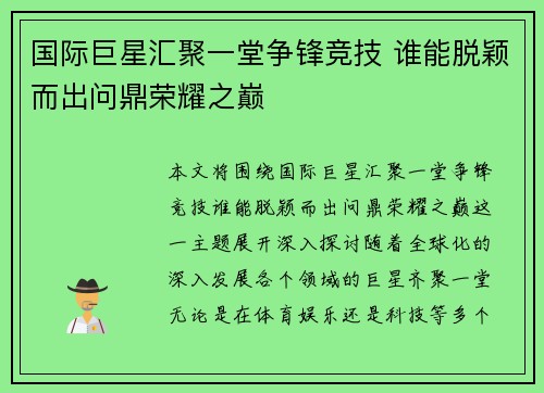 国际巨星汇聚一堂争锋竞技 谁能脱颖而出问鼎荣耀之巅