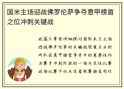 这篇文章将详细探讨国际米兰主场迎战佛罗伦萨的关键战役,重点分析两队在意甲榜首争夺中的重要性。作为赛季冲刺阶段的一场决定性比赛,这场比赛不仅决定着联赛排名,也对两队后续的冠军争夺产生深远影响。文章将从四个方面进行阐述:1) 两队的当前状态与赛...