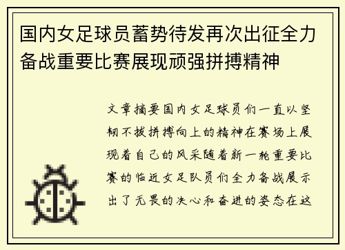 文章摘要:国内女足球员们一直以坚韧不拔、拼搏向上的精神在赛场上展现着自己的风采。随着新一轮重要比赛的临近,女足队员们全力备战,展示出了无畏的决心和奋进的姿态。在这篇文章中,我们将从四个方面阐述国内女足球员在备战重要比赛过程中的艰辛努力与顽强...