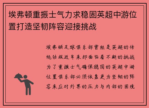 埃弗顿重振士气力求稳固英超中游位置打造坚韧阵容迎接挑战