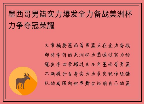 墨西哥男篮实力爆发全力备战美洲杯力争夺冠荣耀