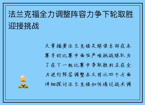 法兰克福全力调整阵容力争下轮取胜迎接挑战