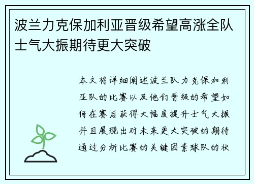 波兰力克保加利亚晋级希望高涨全队士气大振期待更大突破