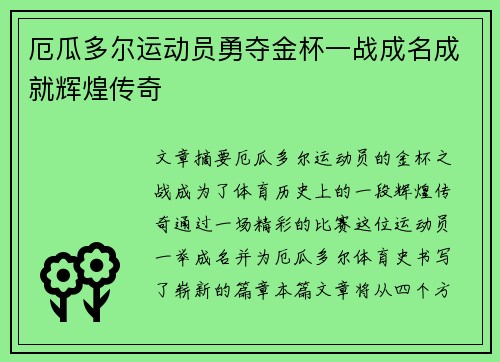 文章摘要:厄瓜多尔运动员的金杯之战,成为了体育历史上的一段辉煌传奇。通过一场精彩的比赛,这位运动员一举成名,并为厄瓜多尔体育史书写了崭新的篇章。本篇文章将从四个方面进行详细阐述:首先,探讨这位运动员的成长历程与早期经历,了解他如何从一个普通...