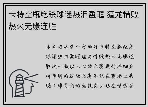 本文将从多个方面对"卡特空瓶绝杀,球迷热泪盈眶,猛龙惜败热火无缘连胜"这一激动人心的比赛进行详细分析与解读。这场比赛不仅在赛场上展现了球员们的竞技实力,也在情感层面给球迷带来了极大的震撼。我们将从以下几个方面进行深入探讨:卡特的空瓶绝杀,球...