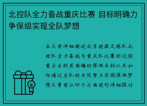 本文将详细阐述北京控股足球队(北控队)全力备战与重庆队比赛的过程,重点分析其明确的保级目标以及如何通过全队的共同努力,实现保级梦想。文章将从四个方面进行详细探讨,首先是北控队目前的困境与比赛的重要性,其次是全队上下的备战态度与方法,然后是教...