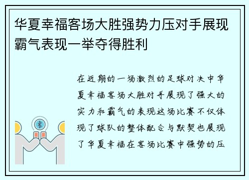 在近期的一场激烈的足球对决中,华夏幸福客场大胜对手,展现了强大的实力和霸气的表现。这场比赛不仅体现了球队的整体配合与默契,也展现了华夏幸福在客场比赛中强势的压制力。通过这场胜利,华夏幸福不仅为自己争得了荣誉,也让球迷见证了他们在对抗强敌时的...