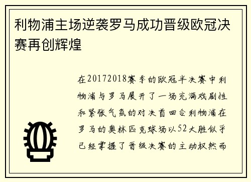 利物浦主场逆袭罗马成功晋级欧冠决赛再创辉煌