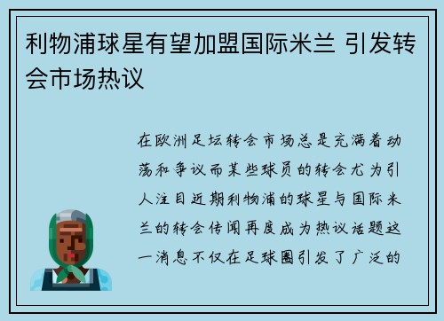 在欧洲足坛,转会市场总是充满着动荡和争议,而某些球员的转会尤为引人注目。近期,利物浦的球星与国际米兰的转会传闻再度成为热议话题,这一消息不仅在足球圈引发了广泛的讨论,也使得国际米兰的球迷们充满期待。利物浦和国际米兰分别是英超和意甲两大传统豪...