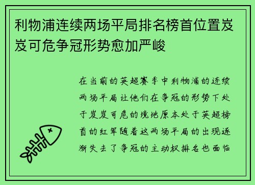 利物浦连续两场平局排名榜首位置岌岌可危争冠形势愈加严峻