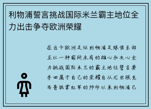 利物浦誓言挑战国际米兰霸主地位全力出击争夺欧洲荣耀