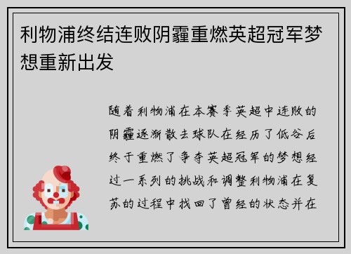 利物浦终结连败阴霾重燃英超冠军梦想重新出发