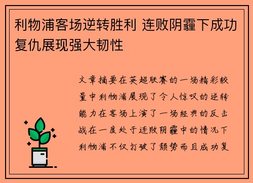 利物浦客场逆转胜利 连败阴霾下成功复仇展现强大韧性