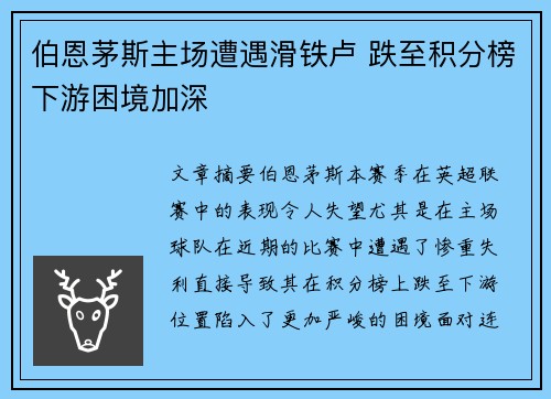 伯恩茅斯主场遭遇滑铁卢 跌至积分榜下游困境加深
