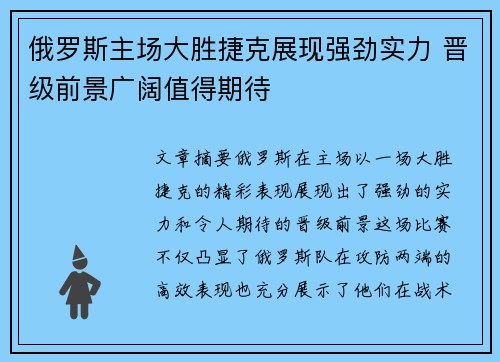 俄罗斯主场大胜捷克展现强劲实力 晋级前景广阔值得期待