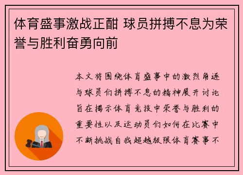 体育盛事激战正酣 球员拼搏不息为荣誉与胜利奋勇向前