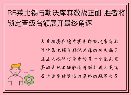 RB莱比锡与勒沃库森激战正酣 胜者将锁定晋级名额展开最终角逐
