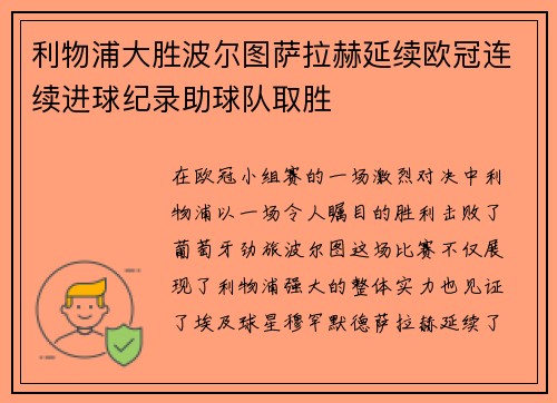 利物浦大胜波尔图萨拉赫延续欧冠连续进球纪录助球队取胜