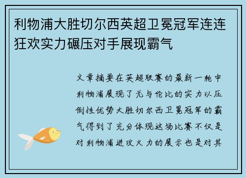 利物浦大胜切尔西英超卫冕冠军连连狂欢实力碾压对手展现霸气