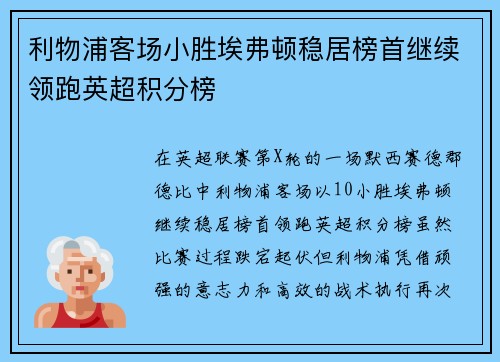 在英超联赛第X轮的一场默西赛德郡德比中,利物浦客场以1-0小胜埃弗顿,继续稳居榜首,领跑英超积分榜。虽然比赛过程跌宕起伏,但利物浦凭借顽强的意志力和高效的战术执行,再次证明了他们在争冠道路上的竞争力。本文将从四个方面对利物浦客场小胜埃弗顿稳...