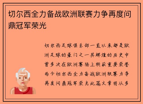 切尔西全力备战欧洲联赛力争再度问鼎冠军荣光